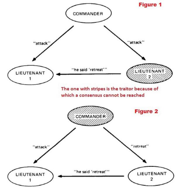 很自然地,下一步是用协议来处理那些可以利用他们收集的信息来任意行动的对手。这可能包括发送错误或冲突的消息。这些对手被称为拜占庭或活跃的对手。拜占庭这个词来源于莱斯利·兰波特1982年写的一篇里程碑式的论文,叫做“拜占庭将军问题”。这篇论文描述了围绕一个城市的拜占庭军队面临的共识问题,他们试图就是否应该进攻或撤退达成一致。当他们试图达成协议时,他们面临着信息被删除、复制和修改的问题。不诚实的将军们的目的是为了确保军队在战争中败下阵来,他们使一部分进攻,另一部分撤退,或者干脆不采取行动。尽管存在所有这些挑战,但所有诚实将军的目标都是以一种共同的方式行事。