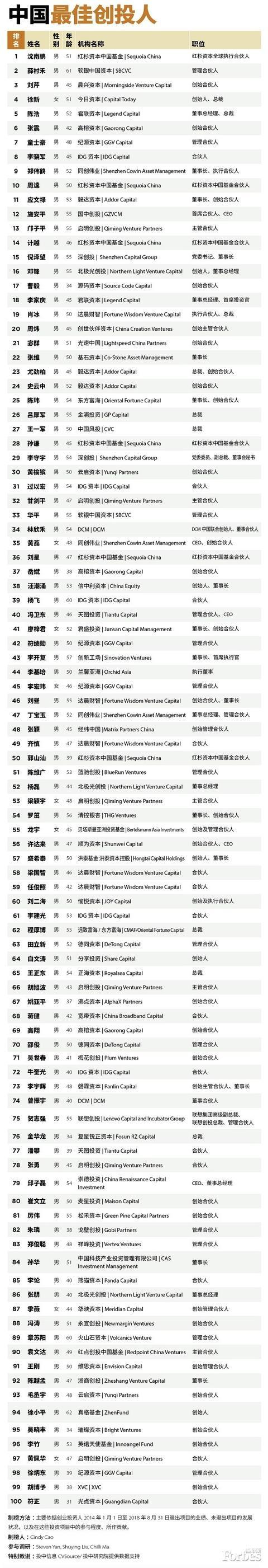 宏观 > 福布斯中国发布2018最佳创投人TOP100榜 红杉资本沈南鹏荣登榜首