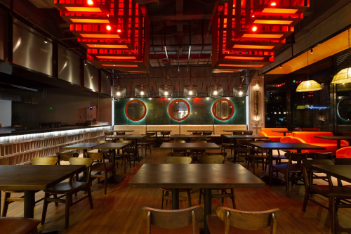 暖色系射灯和座椅,以及绿植的点缀,也使得该区域也呈现出自然、沉稳、平和的氛围。一墙之隔的另一公共区域,则运用红绿配色演绎了东方国潮美学。
