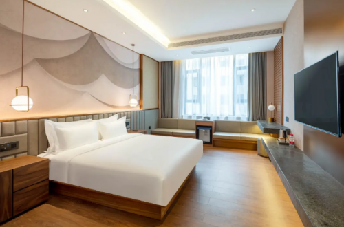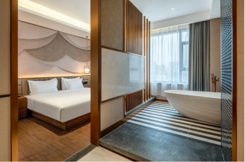 客房整体极简素雅,背景画上连续起伏写意山脉,为空间注入了自由和宁静。在床和床头柜等处,则选用质感细腻的木材点缀,与当地的传统木构建筑相呼应,隐喻着建筑所处的人文环境。 ZMAX HOTELS·晋中安宁街印象城店一共有7种房型,还有内置惊喜的彩蛋房,酒店大堂设有精酿餐吧ZaoBar。