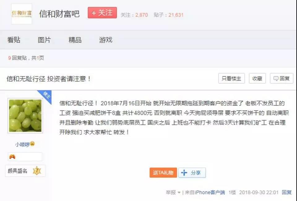 再后来,信和的员工就变成了前员工。在信和财富贴吧里,前员工曝料称,已经拖欠了3个月工资没发,老板还强迫员工买减肥饼干,8盒4800元,不买就只能恶性离职。