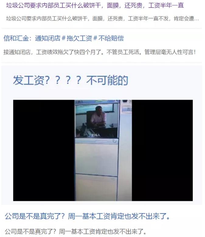 这不是个例,在信和汇金贴吧里,几乎条条都是拖欠员工工资,最后被各种套路后强制离职的。其中有一条视频曝料夏靖没钱给员工发工资,直接回怼:“让他们去告!怕他们闹事?我才不怕呢!急眼了,急眼了破产!”