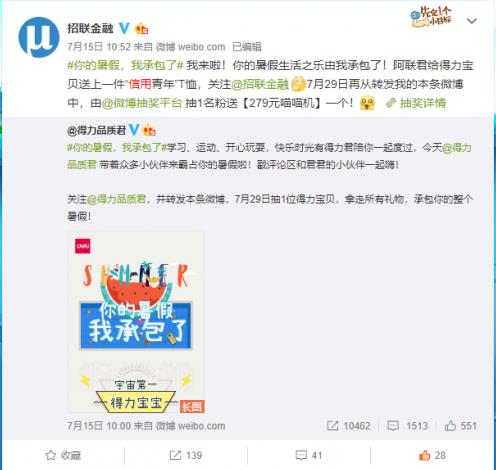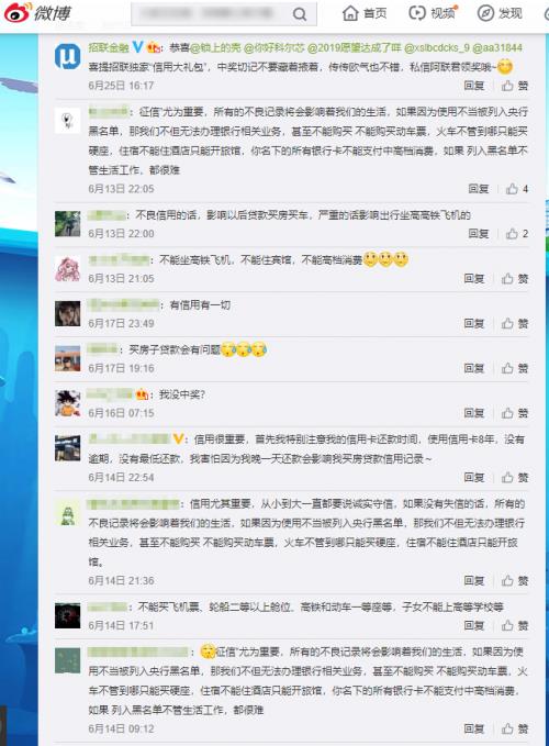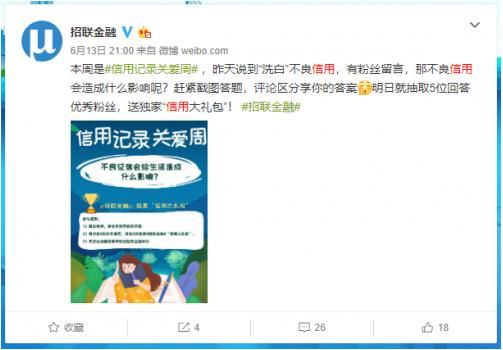 6月14日,招联金融响应中国人民银行的“信用记录关爱日”,从专业信审的角度提出了维护个人信用的三个建议。此后,招联金融利用新浪微博这个脍炙人口的社交媒体平台频频发力,不但举办了“信用记录关爱周”活动,向公众普及了如何“洗白”不良征信的相关知识,2019年7月16日,招联金融还与微众银行联袂举行“信用让你的生活发生了什么变化”转发抽奖小活动,向网友送出“信用大礼包”,许多网友纷纷留言转发。此外,招联金融还在微博上主持了“信用青年说”等话题。
