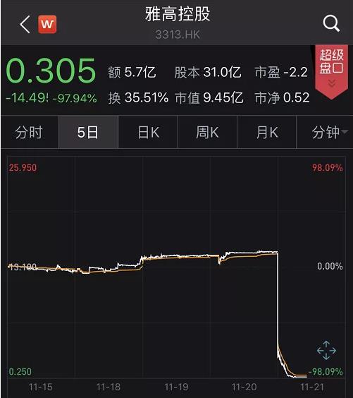 今早开盘,雅高控股(3313.HK)便遭遇洗仓股价闪电跳水,盘中一度暴跌98.34%至历史新低价0.246港元。截止午间收盘,股价暴跌97.94%,现已停牌,报价0.305港元,成交额为5.18亿港,现总市值报9.45亿,较昨日相比2小时蒸发了近450亿!