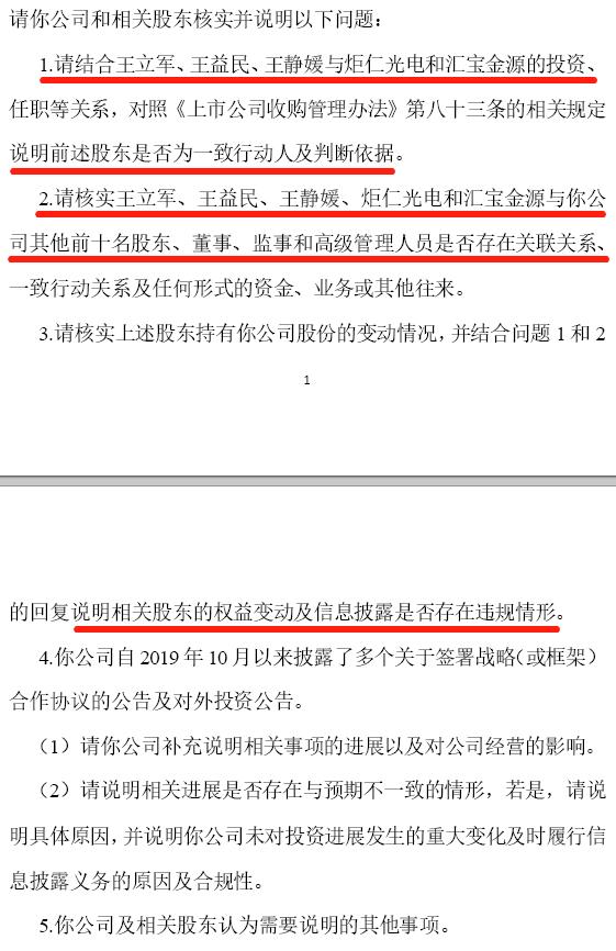 股东的书面回复未明确确认,其是否相互构成一致行动关系。金运激光则替其承认了一致行动关系:“如无相反证据,王立军、王益民、王静媛与炬仁光电、汇宝金源、海坤控股、太平通讯及太平集团互为一致行动人。”