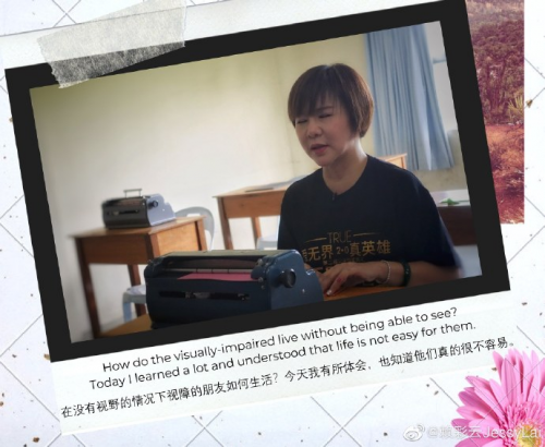 在社会的弱势群体中,视障群体更加特殊,因为视障群体看不到,生活中有很多困难之处。赖彩云体会了视障人士的生活后,在自己的个人微博中写道:“在没有视野的情况下视障的朋友如何生活?今天我有所体会,知道他们真的很不容易,我们应该给予视障的朋友更多的理解与尊重。”
